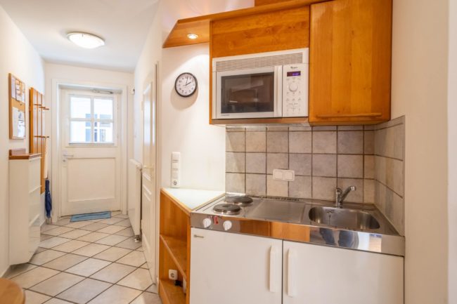 Die Appartements im Obergeschoss bestehen aus zwei Zimmern, verfügen über eine Küchenzeile, eine zusätzliche Schlafcouch und ein Dusch-WC. Annehmlichkeiten wie Fernseher, Telefon, Handtücher, Bettwäsche, Haartrockner und Kosmetikspiegel gehören selbstverständlich zur Ausstattung der Wohnungen.