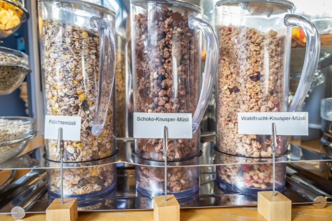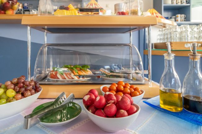 Unser Kaffeevollautomat versorgt Sie per Knopfdruck mit Ihrer liebsten Kaffeespezialität – ob Latte Macchiato, Cappuccino oder Espresso. Genießen Sie bei einer Tasse Kaffee die frisch aufgebackenen Brötchen, Rührei und verschiedene Säfte. Mit unserer großen Auswahl an Wurst- sowie Käsesorten und den hausgemachten Salaten ist für jeden Geschmack etwas dabei. Verschiedene Müslisorten sowie Obst und Gemüse runden unser Frühstücksbuffet perfekt ab.